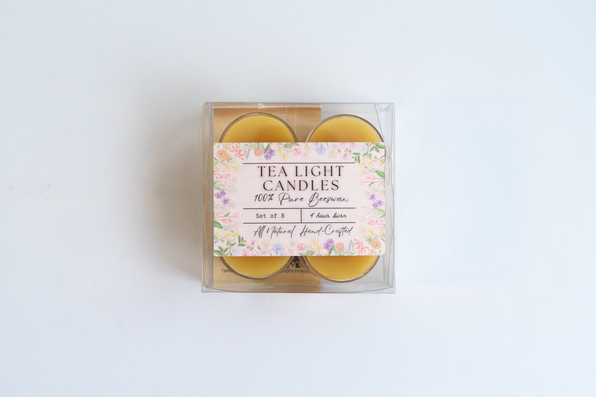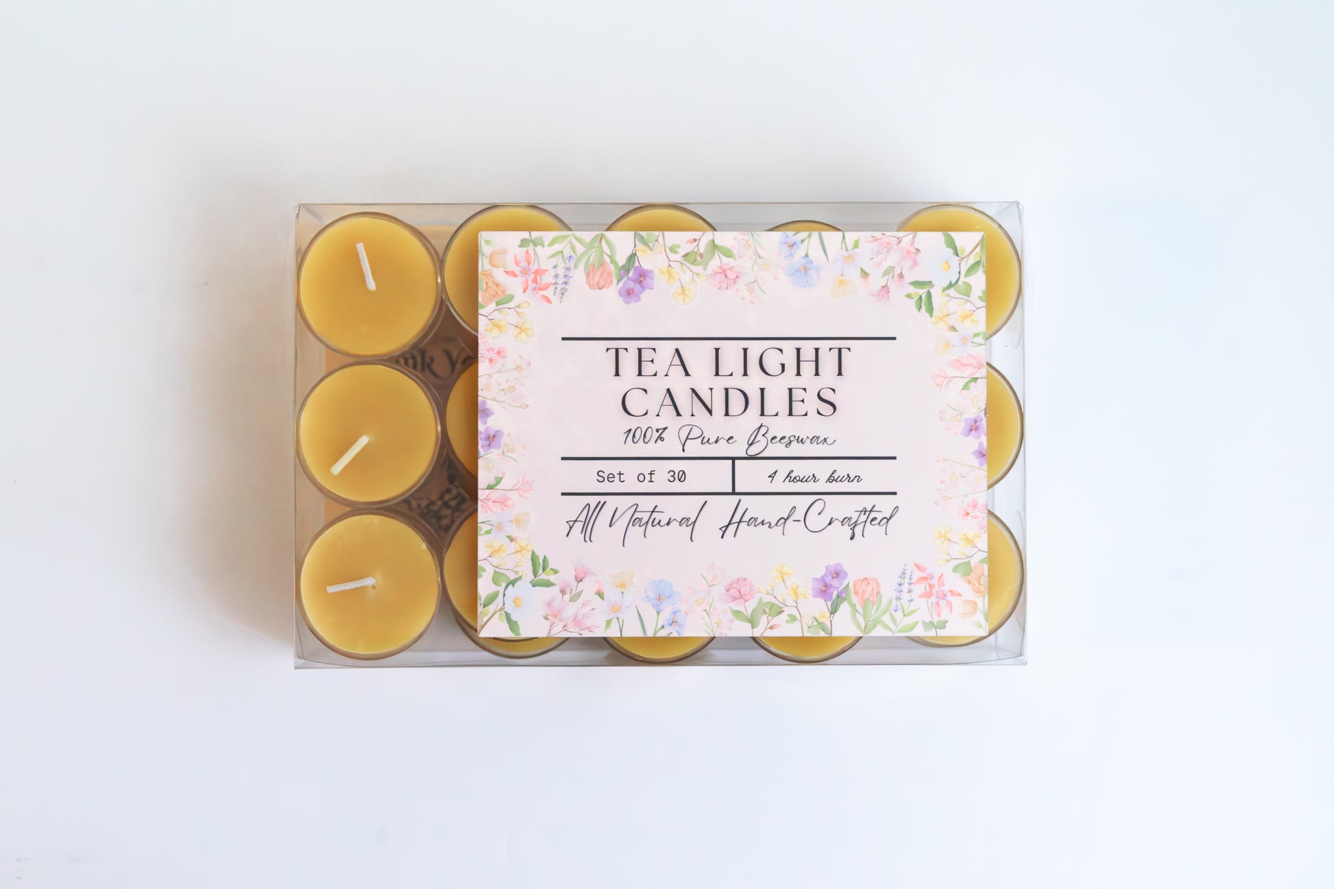 Crafted from 100% pure, locally sourced Ontario beeswax, these hand-poured tea lights offer a clean and natural glow. Available in sets of 8 or 30, each candle comes with its own reusable holder, making them perfect for table settings or decorative accents. Their subtle honey scent and sustainable materials make them an elegant, eco-conscious addition to any space or a thoughtful gift.