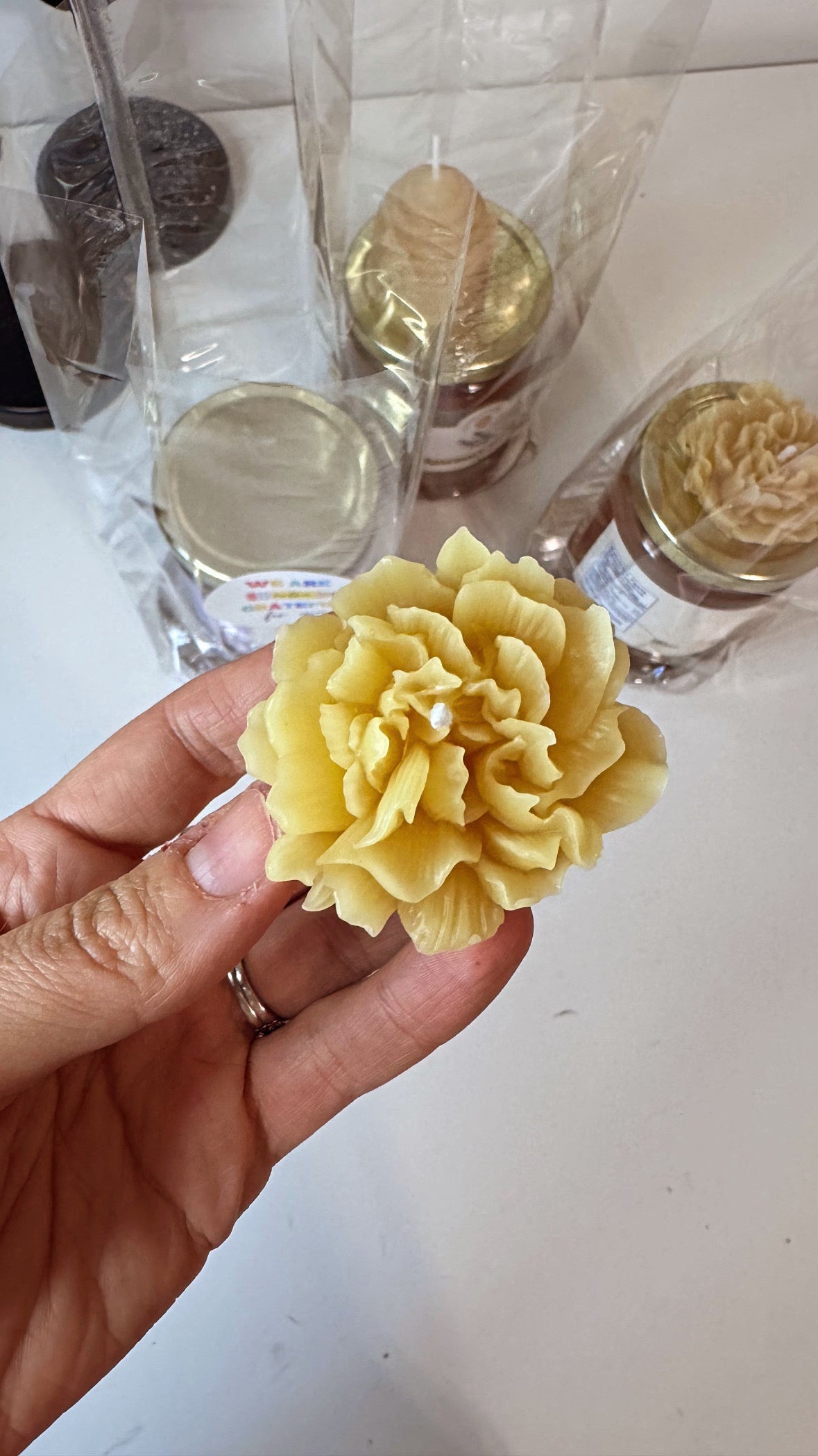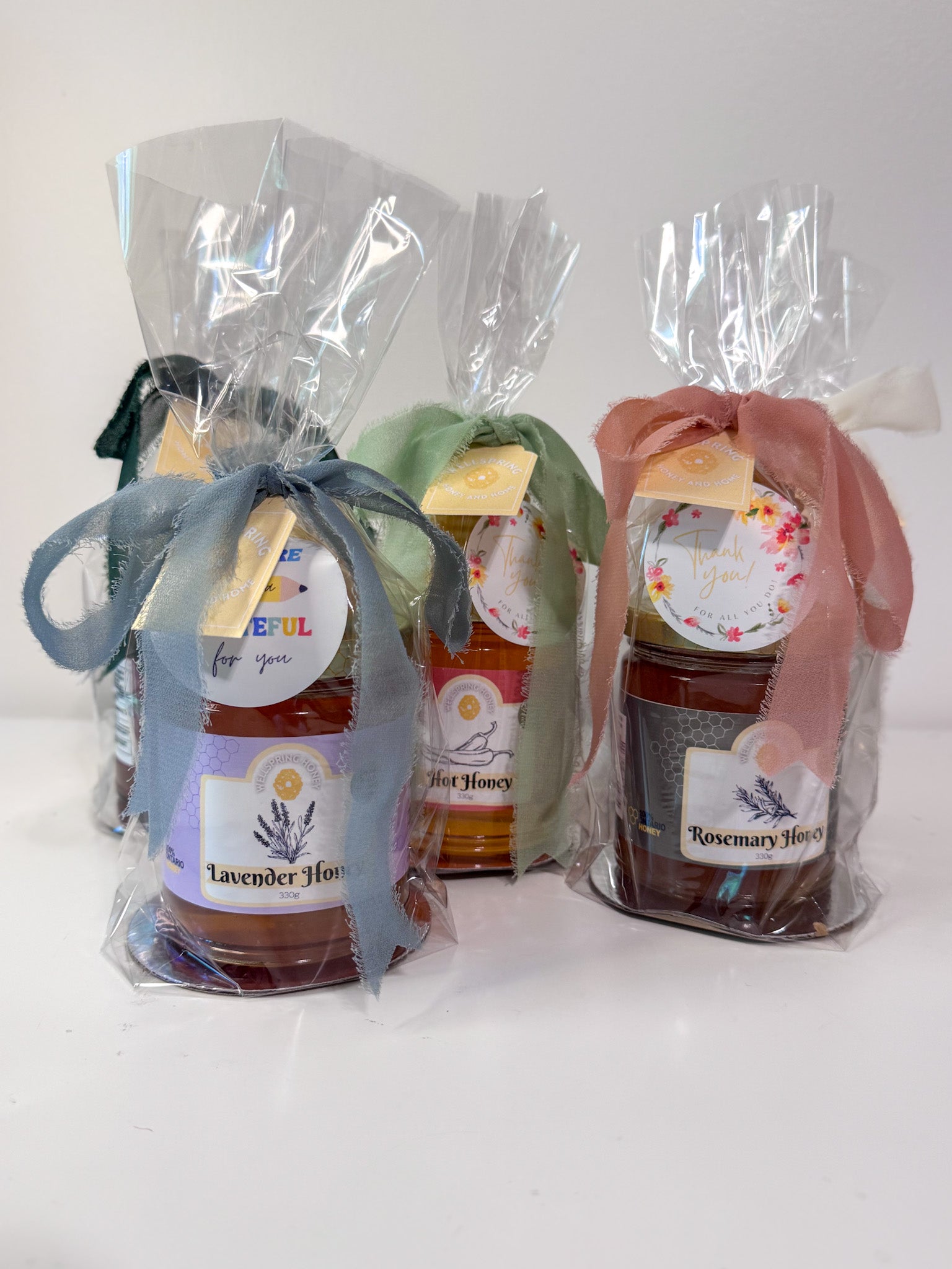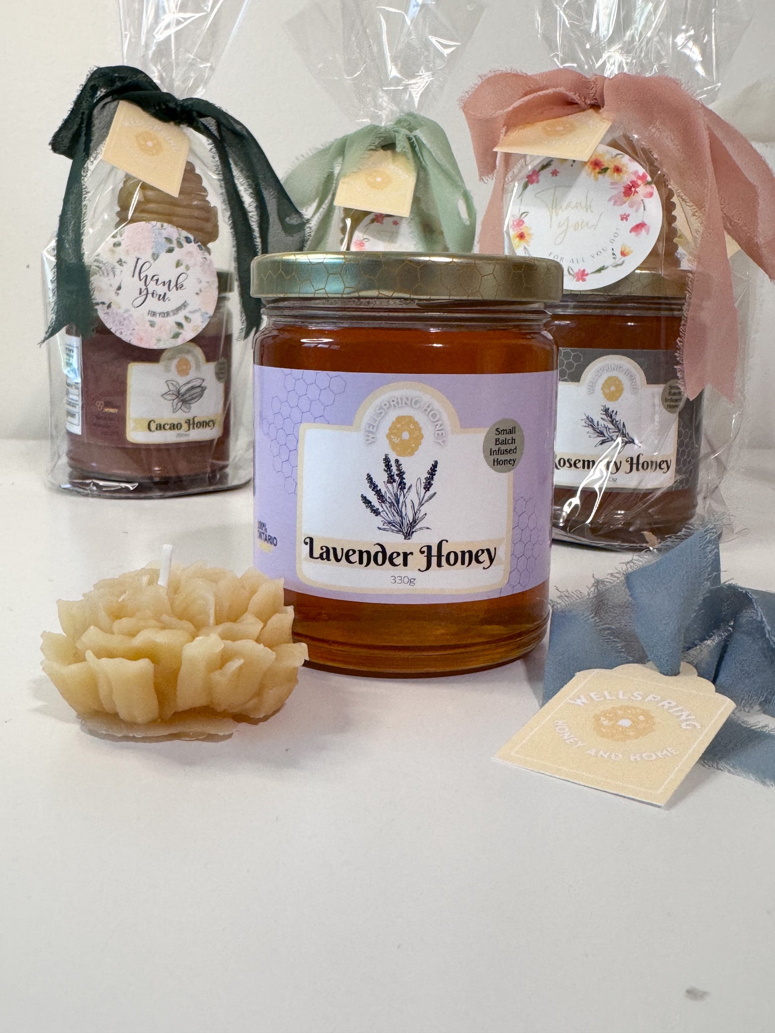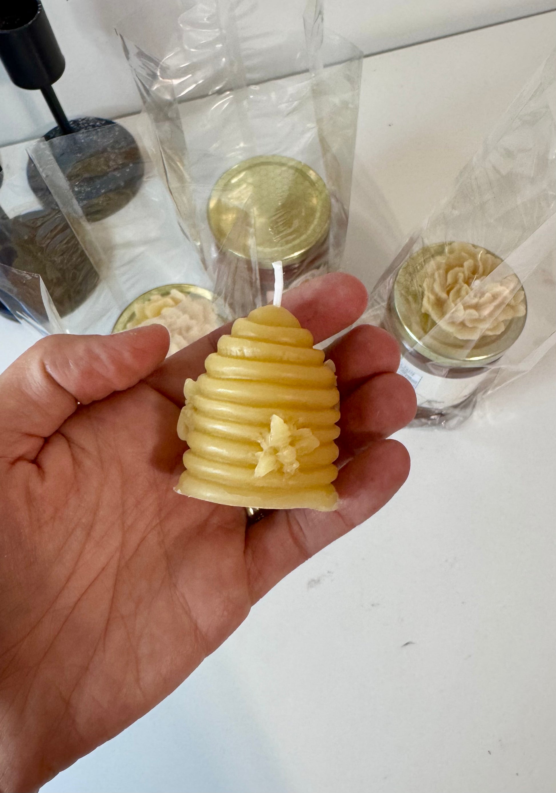 Each set includes your choice of one of our 9 deliciously unique infused honey jars – from comforting Vanilla to zesty Hot Honey – paired with a hand-poured beeswax candle in your choice of style: a delicate flower tea light or a charming bee skep votive.