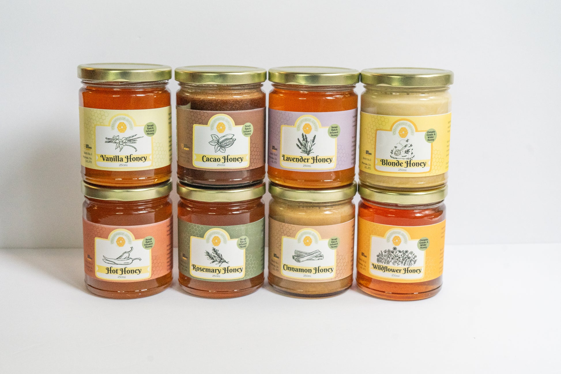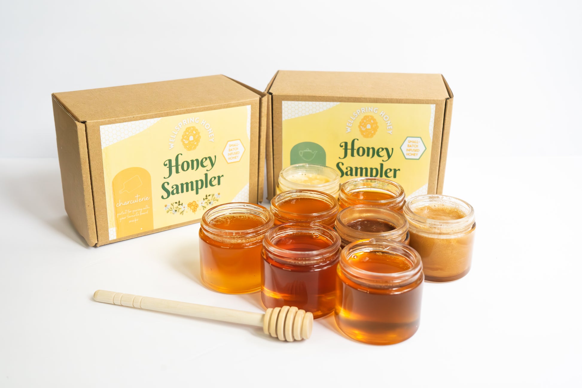 Discover the full spectrum of gourmet flavors with our Ultimate Honey Tasting Sample Box—a luxurious collection that brings together all eight of our most beloved honey varieties. This set is the perfect way to experience the rich diversity of our small-batch infusions, featuring: